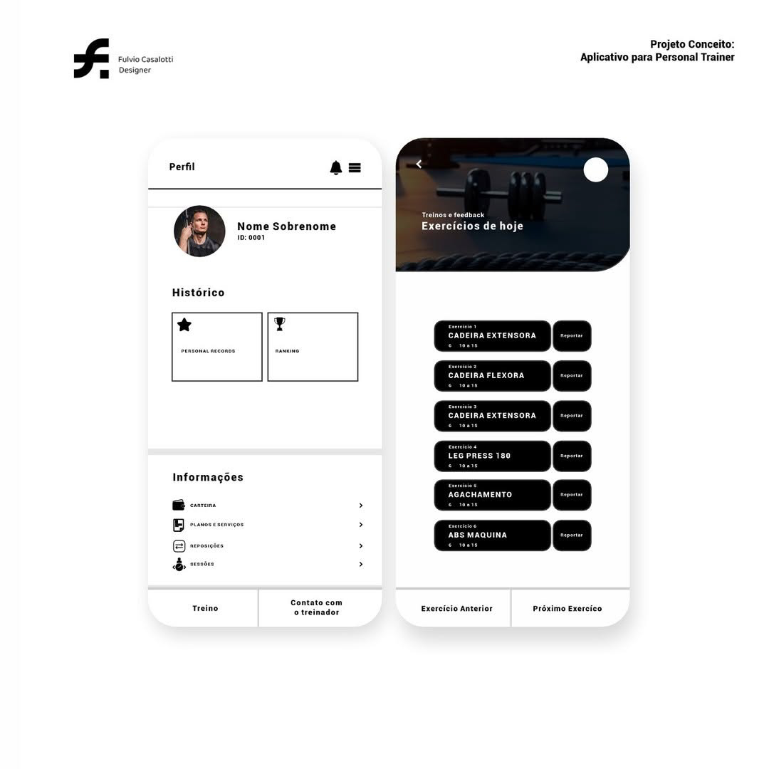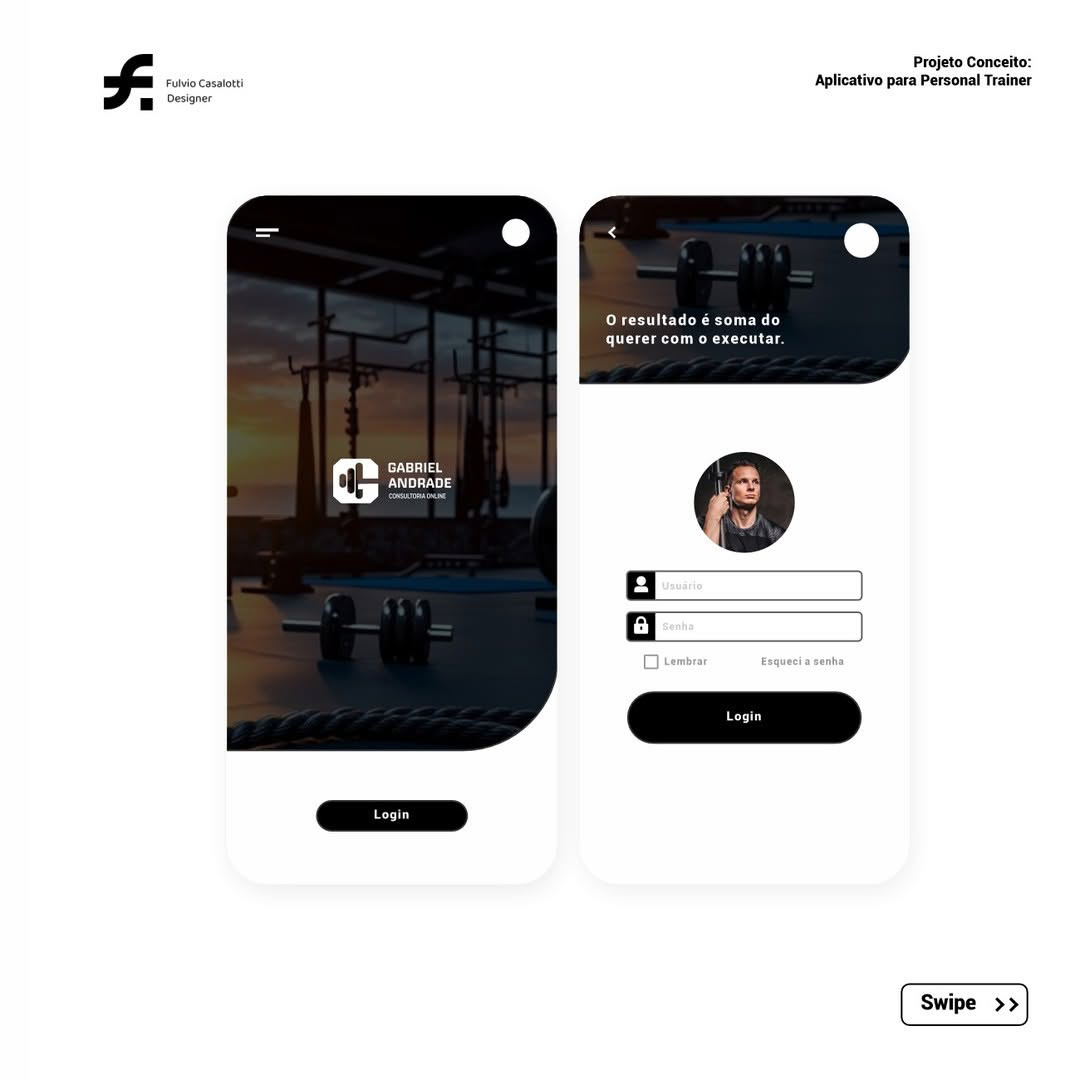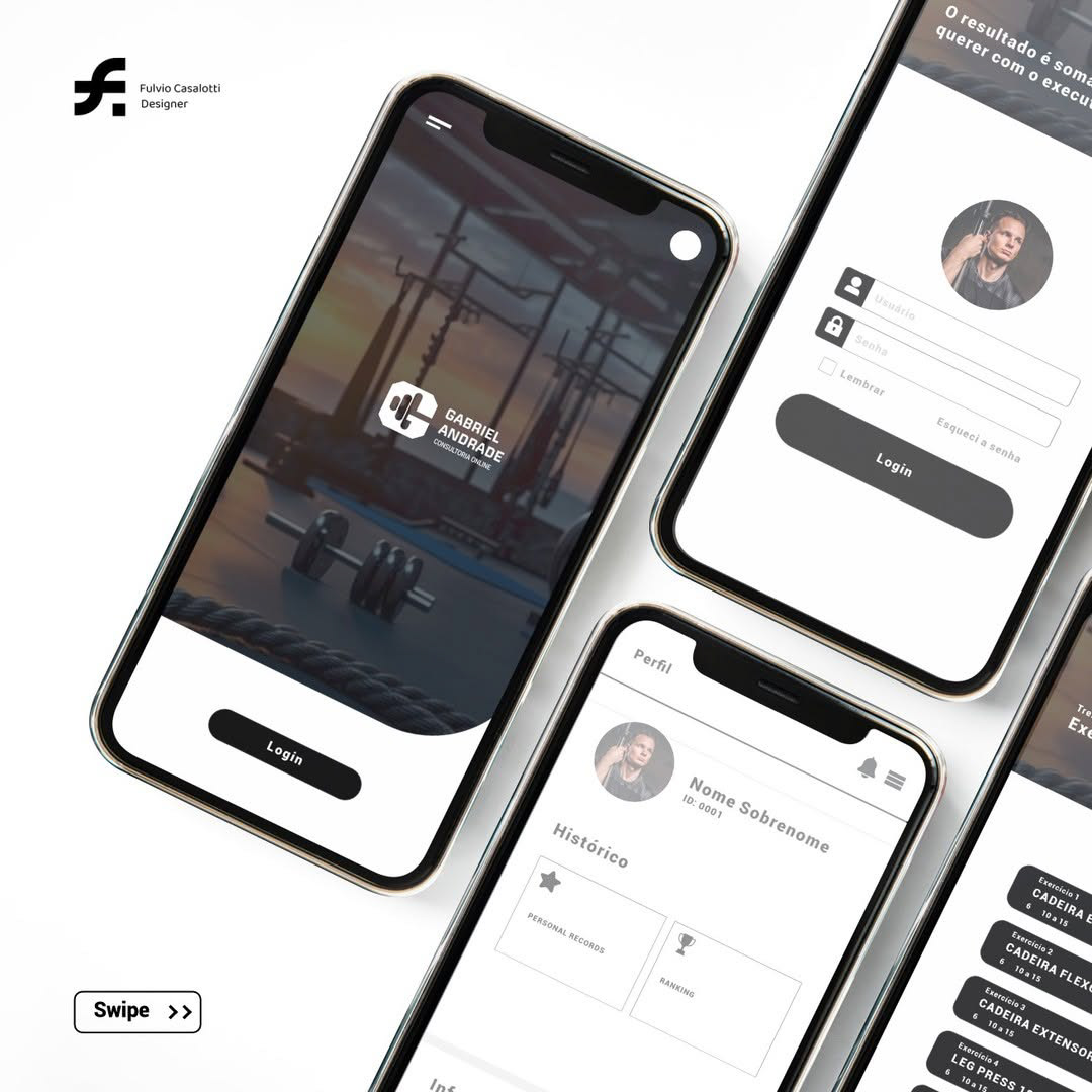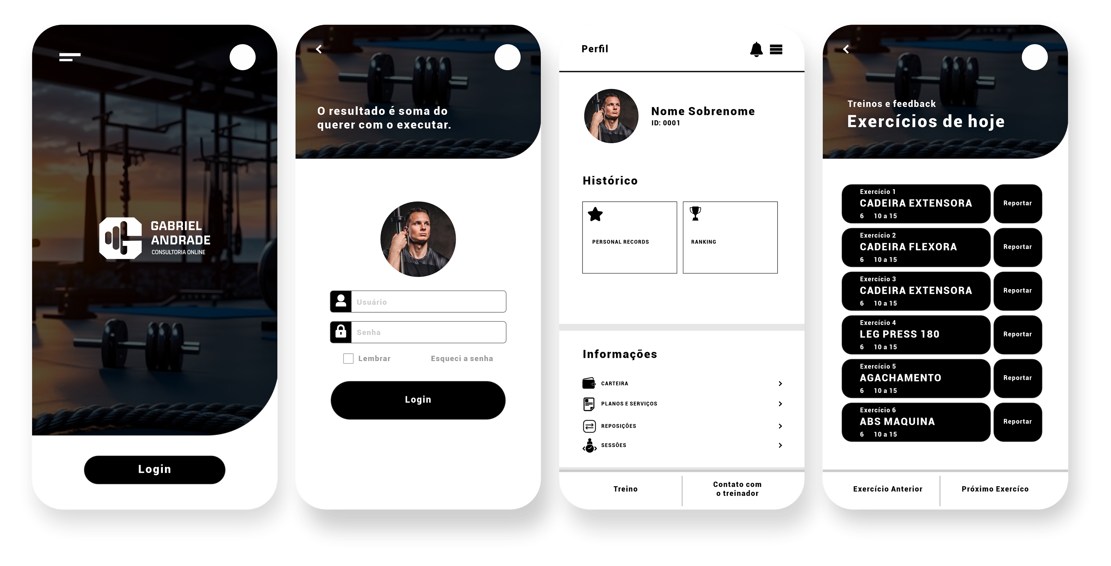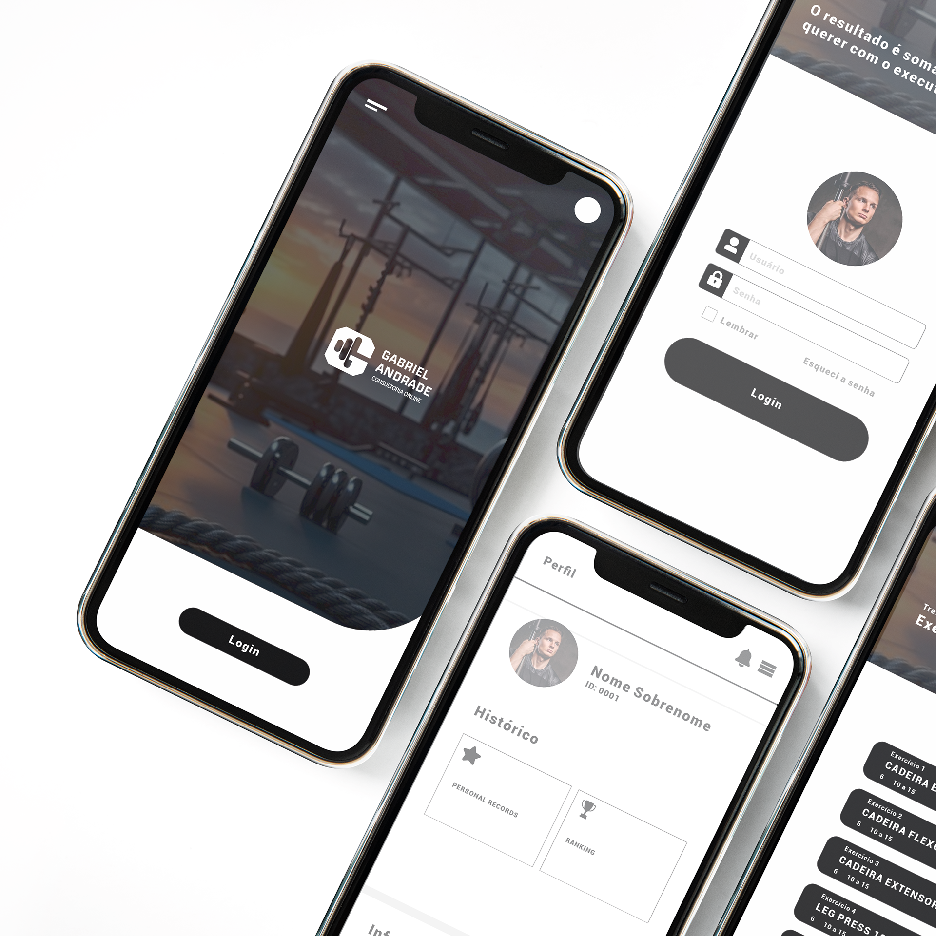 O layout do aplicativo desenvolvido para Gabriel Andrade foi pensado para traduzir, em ambiente digital, os principais pilares de sua atuação como personal trainer: acessibilidade, foco, motivação e profissionalismo.
